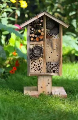 昆虫旅馆(Insect Hotel)就是采用自然材料、依照虫儿习性制作,供虫类繁殖、栖息及越冬的场所。利用回收材料,比如废弃塑胶管、废旧木材、枯枝落叶、秸秆树皮等等,分割出不同的“房间”,然后填充不同的材料,设计营造一个独特的昆虫旅馆。